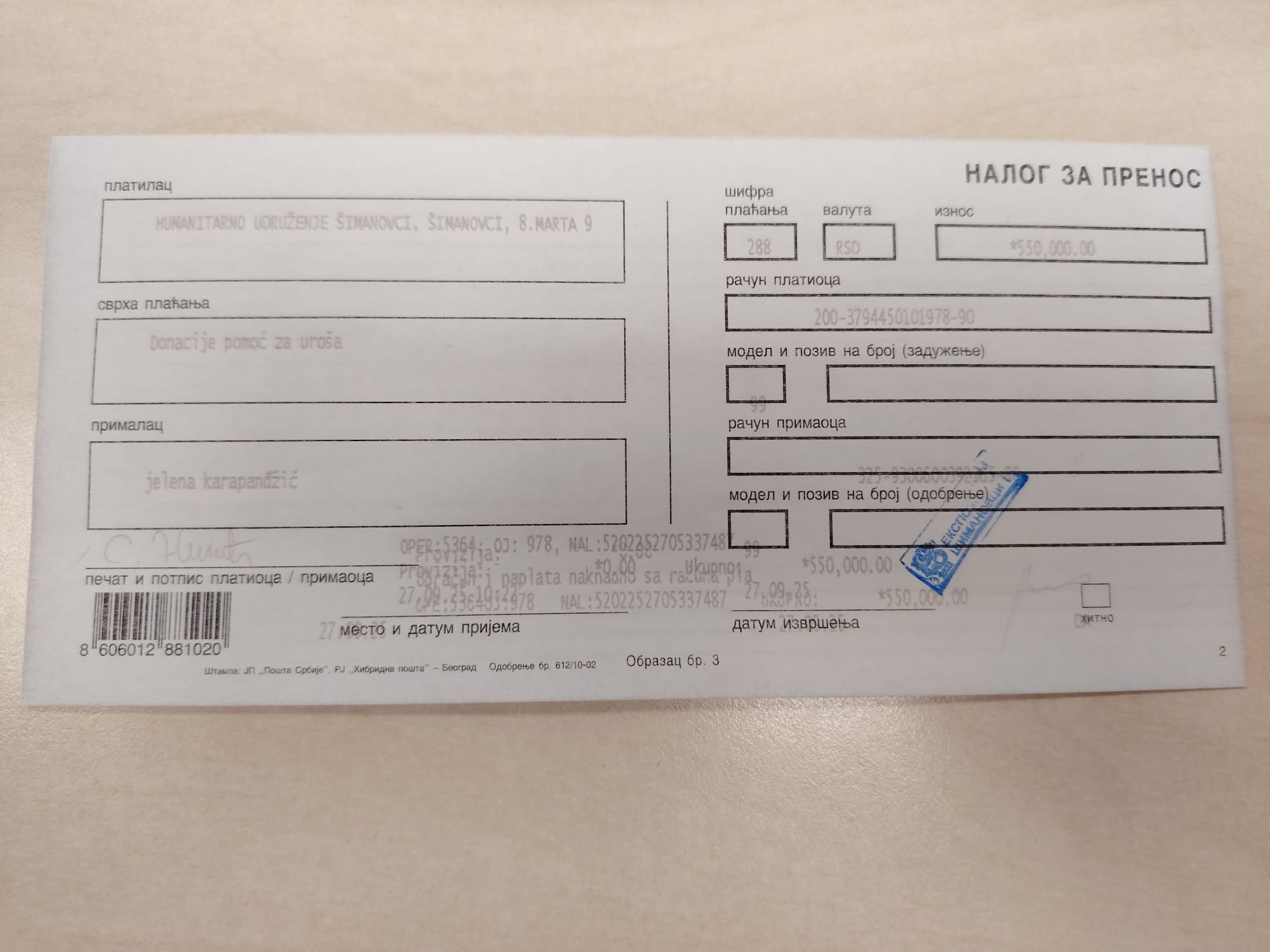 💙 Заједничким снагама прикупљено је и уплаћено 550.000 динара за лечење Уроша Карапанџића. Хвала свима који су допринели – свака донација је била корак ка нади.