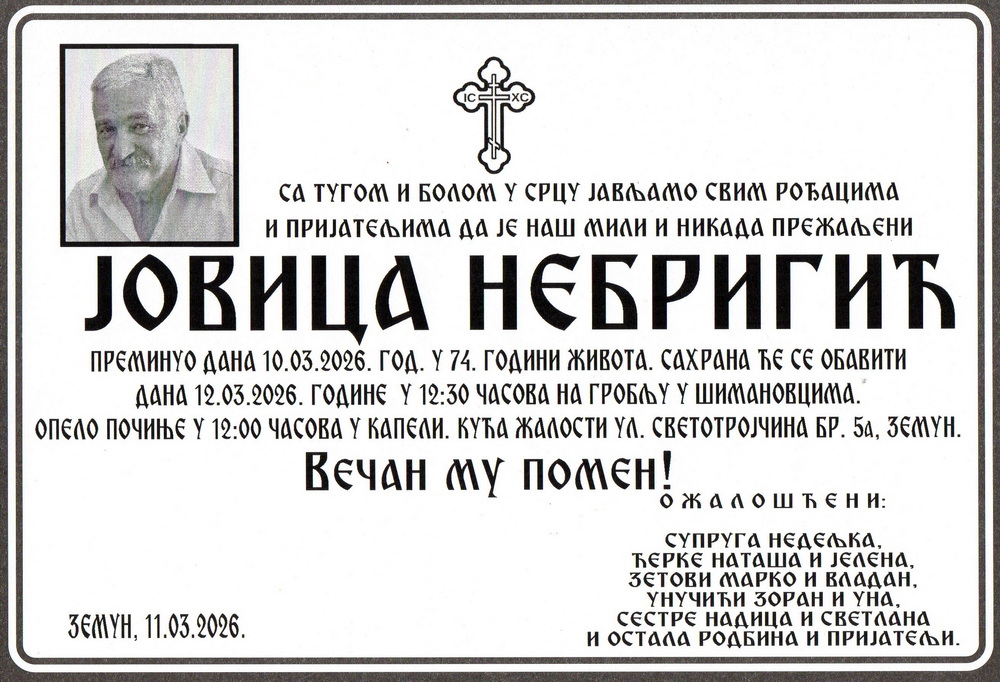 Јуче 10. марта 2026. године у болници у Земуну преминуо је Јовица Небригић пензионер из Земуна. Јовица је раније живео у улици Крњешевачкој број 15 у Шимановцима. Рођен је 15. децембра 1952. године у Шимановцима. Јовица се оженио Недељком са којом је добио две ћерке Наташу и Јелену.