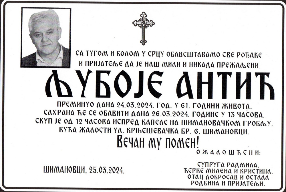 Сахрана Љубоја Антића биће обављена сутра у уторак 26. марта 2024. године. Скуп је од 12.00 часова испред капеле у Шимановцима. Опело ће почети у капели у 13.00 часова и Љубоје ће бити сахрањен на шимановачком месном гробљу.