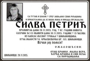 Јутрос 29. новембра 2025. године у свом дому у Шимановцима преминула је Силва Петрић пензионер из Шимановаца. Силва је живела у улици Крњешевачкој број 153 у Шимановцима. Рођена је 14. маја 1958. године у Земуну. Удала се за Станислава Петрића са којим је добила двоје деце; ћерку Бранку и сина Првослава. Сахрана Силве Петрић биће обављена сутра у недељу 30. новембра 2025. године. Скуп је од 12.00 часова испред капеле у Шимановцима. Опело ће почети у капели у 13.00 часова и Силва ће бити сахрањена на шимановачком месном гробљу.