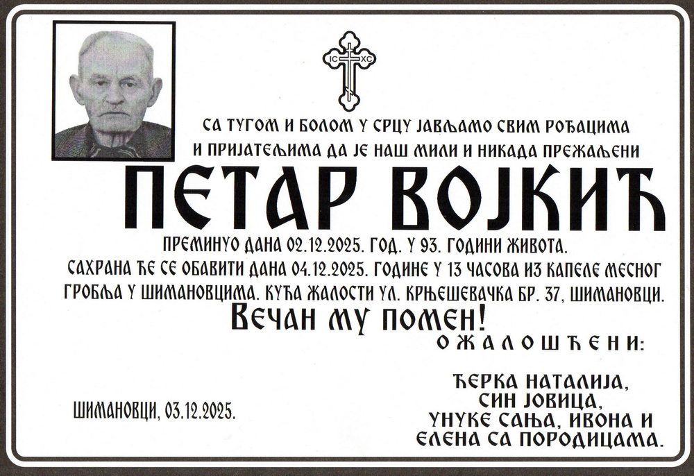 Синоћ 2. децембра 2025. године у болници на Бежанијској коси преминуо је Петар Војкић пензионер из Шимановаца. Петар је живео у улици Крњешевачкој број 37 у Шимановцима. Рођен је 29. августа 1932. године у Шимановцима. Оженио се Бисерком са којом је добио троје деце; ћерке Наталију и +Вукосаву (преминула 1955 год.) и сина Јовицу.