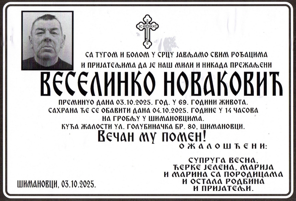 Јутрос рано 03. октобра 2025. године у Шимановцима преминуо је Веселинко (Веско) Новаковић пензионер из Шимановаца. Веселинко је живео у улици Голубиначкој број 80 у Шимановцима. Рођен је 02. октобра 1956. године у месту Велика Попина општина Грачац. Оженио се Весном са којом је добио три ћерке; Јелену, Марију и Марину. Сахрана Веселинка Новаковића биће обављена сутра у суботу 04. октобра 2025. године. Скуп је од 13.00 часова испред капеле у Шимановцима. Опело ће почети у капели у 14.00 часова и Веселинко ће бити сахрањен на шимановачком месном гробљу.